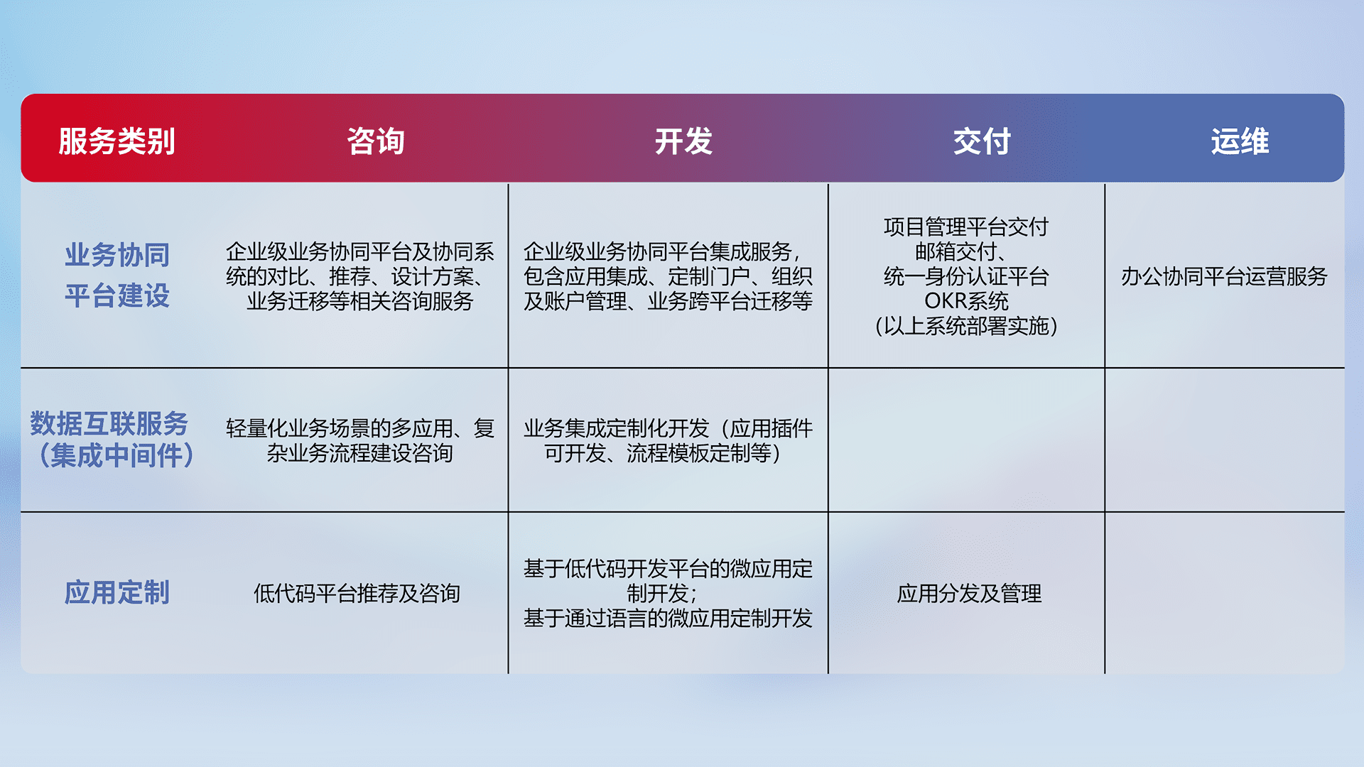 针对钉钉、、、、企微、、、IDaas等平台级产品提供产品的规划、、、、方案、、、、交付、、、定制化开发等服务,,,实现如统一协同办公、、、、智能客户服务、、混合会议管理、、、智能数据查询、、、、等业务场景,,,,实现数字化转型。。
